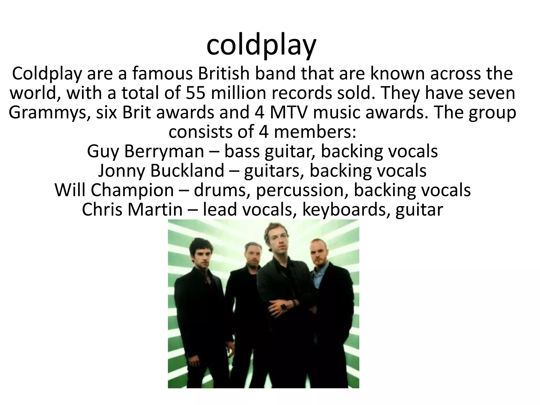 Coldplay are a famous British band consisting of 4 members: Guy Berryman, Jonny Buckland, Will Champion, and Chris Martin. They have sold over 55 million records worldwide and have won numerous awards, including 7 Grammys and 6 Brit awards. Their music has been described as melodic pop with distorted guitar riffs on their first album Parachutes, drawing from bands like U2, Oasis, and Radiohead. Their second album A Rush of Blood to the Head was influenced by artists such as Echo & the Bunnymen and Kate Bush, while later albums explored different genres including art rock and incorporated various instruments beyond their standard sound.