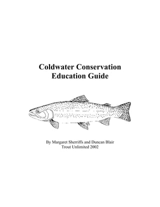 The document is a curriculum guide for teaching coldwater conservation and trout habitat education. It includes 17 activities to teach students about ecological concepts, hydrology, stream life, trout behavior and biology, human impacts on streams, and sustainable fishing practices. The guide is intended to complement fly fishing instruction by providing the scientific background on healthy trout habitats and how human activities can positively or negatively affect these habitats. It contains suggestions for how to use the guide, definitions of key terms, and references for additional teaching resources.