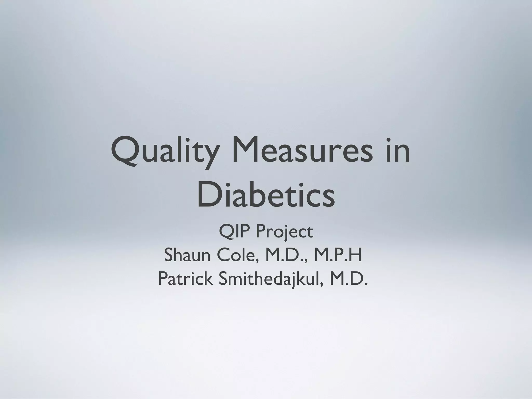 This document outlines a quality improvement project to improve diabetes management in a primary care clinic. It notes that diabetic patients in the clinic are not meeting quality goals for HbA1c, LDL, and blood pressure. The project will test the effectiveness of providing quarterly reports on these measures and one-on-one care manager meetings (the intervention) versus usual care. The intervention aims to increase residents' awareness of clinical guidelines and engage patients. Project outcomes will assess the metrics over time and resident/care manager satisfaction to determine if the intervention is effective and worthwhile.