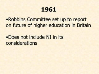 - In the 1960s, a committee was formed to examine the need for a second university in Northern Ireland after Queen's University in Belfast reached capacity. Two sites, Coleraine and Magee College in Derry, lobbied to host the new university.