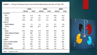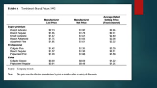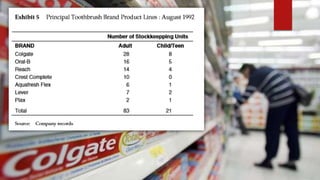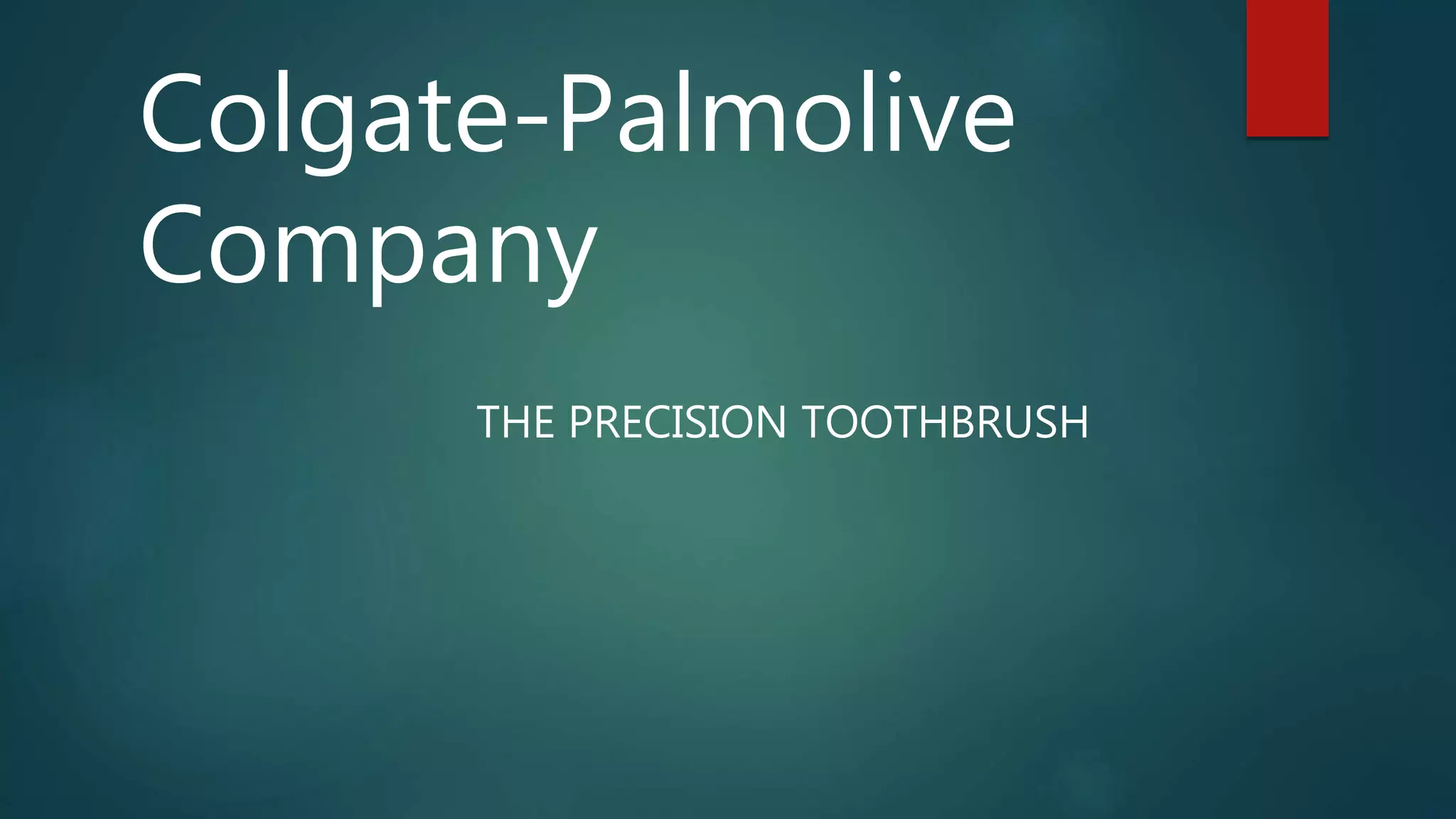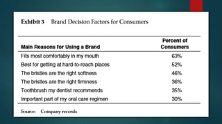 Colgate-Palmolive is launching a new technologically superior toothbrush called the Precision Toothbrush in a competitive market. It faces challenges in gaining credibility and preventing cannibalization of existing products. The document analyzes positioning the brush as a niche or mainstream product, branding, test results that found the brush more effective but unusual looking, and recommendations such as niche marketing initially, aggressive advertising of its benefits, and free dental checkups to promote the issue it addresses.