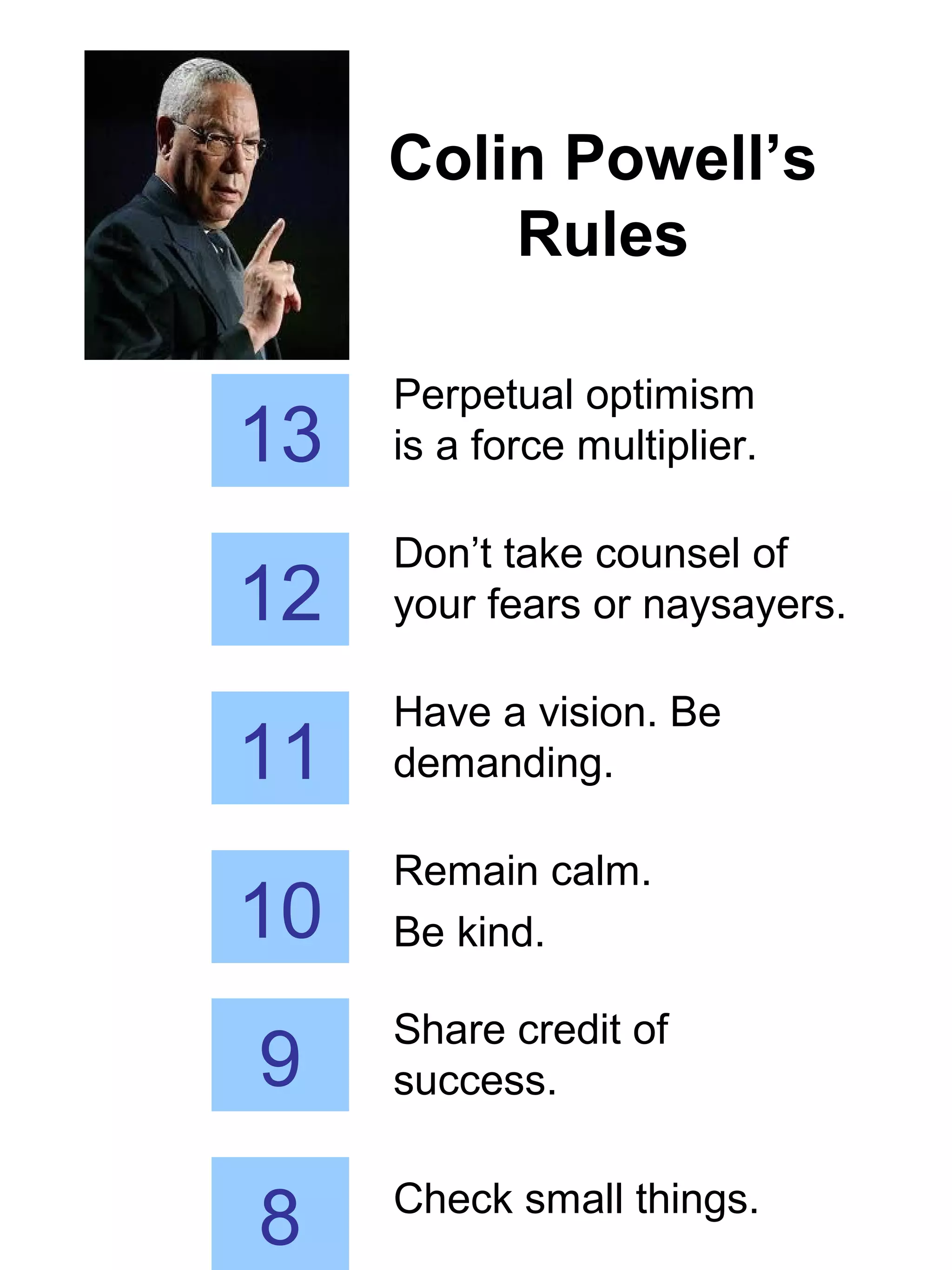Colin Powell provides 13 rules for success, including maintaining a positive outlook, having a vision while also demanding excellence, sharing credit for successes, avoiding letting fears or others' opinions influence your decisions, and not letting your ego be tied to your positions. The rules advise remaining calm, checking small details, moving past anger or adverse facts, being careful what you wish for as you may achieve it, and maintaining optimism that challenges aren't as bad as initially thought.