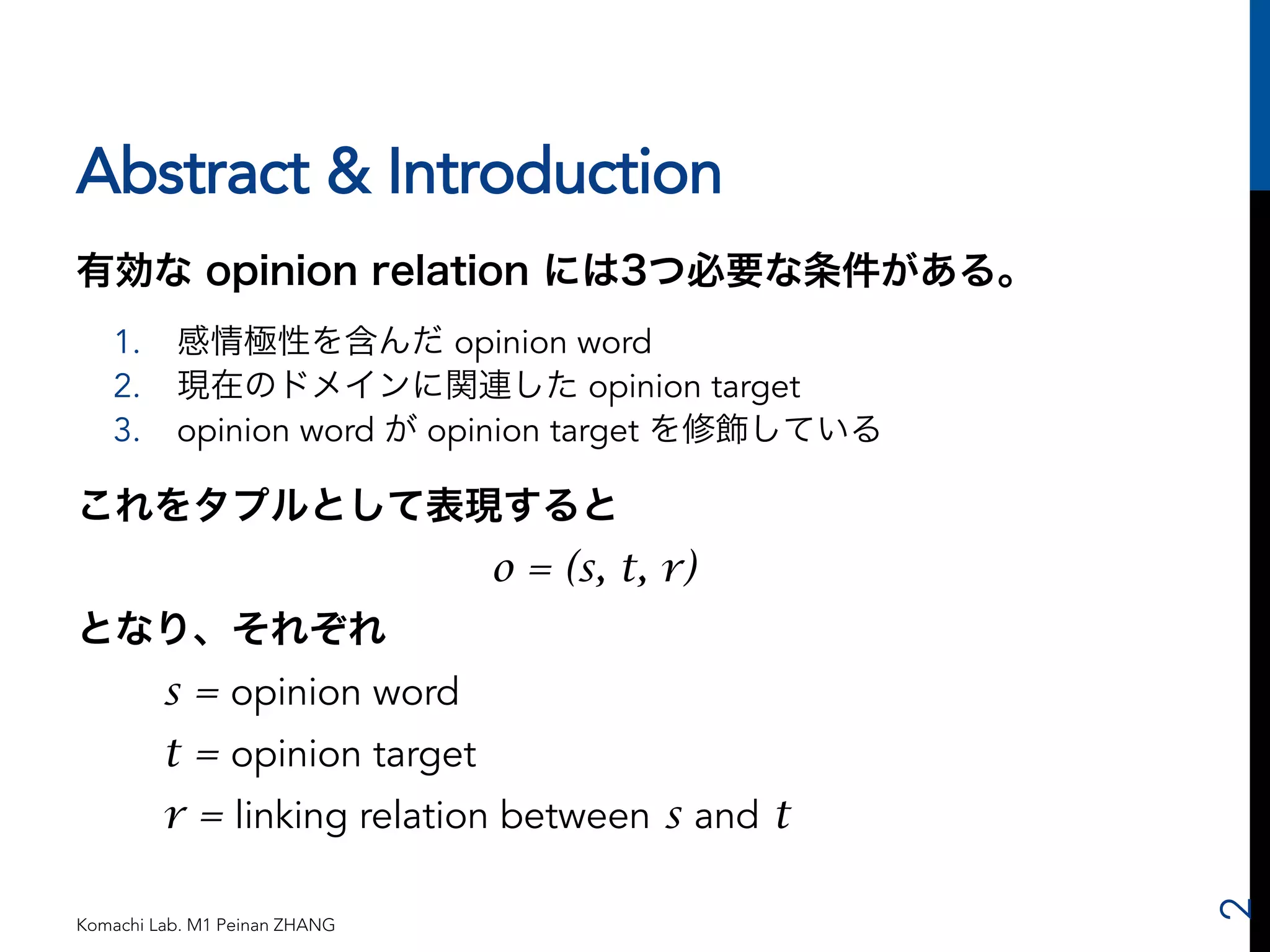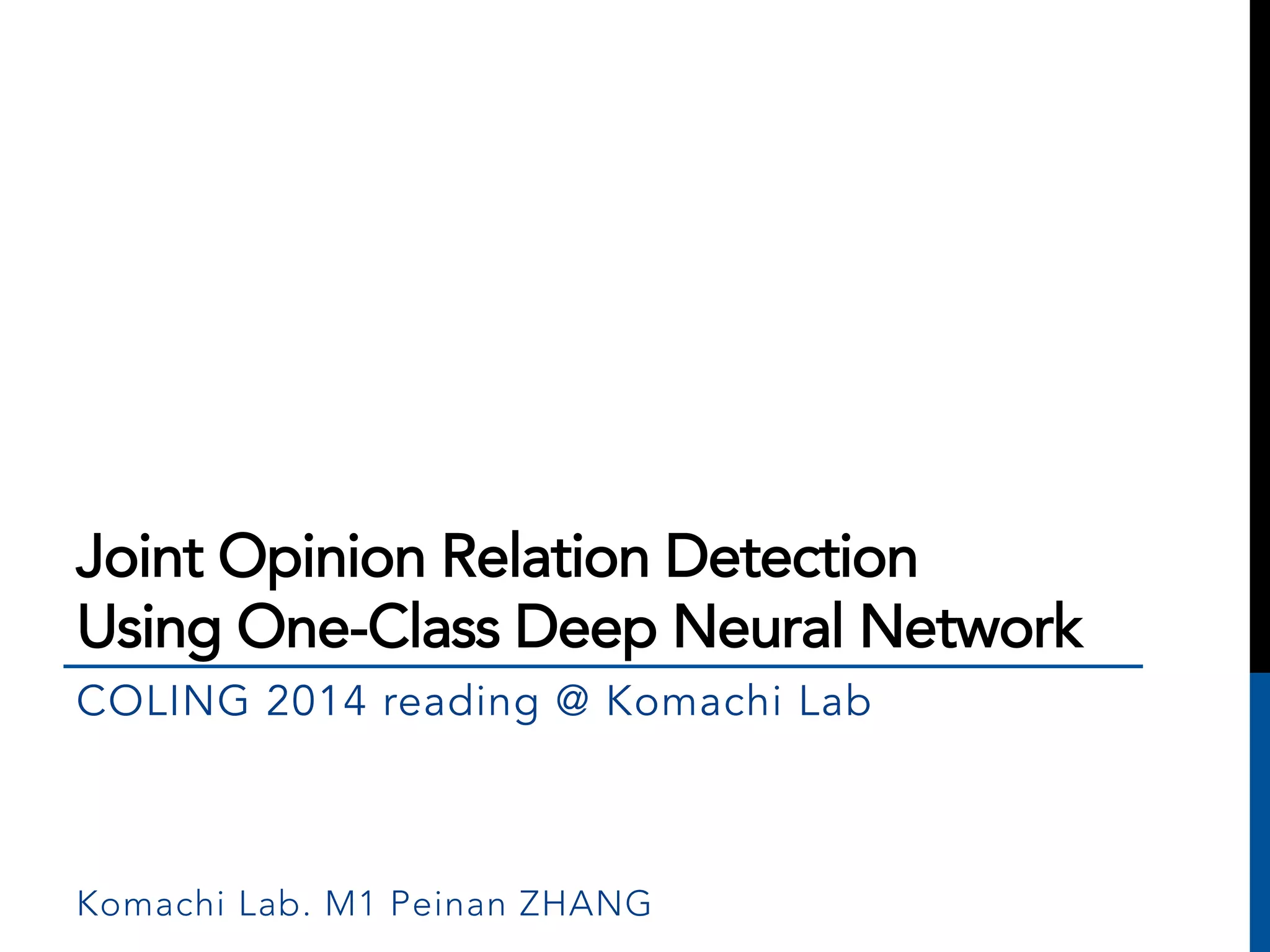 The document proposes a novel joint opinion relation detection method using a one-class deep neural network (OCDNN). It addresses the problems of prior methods by simultaneously considering opinion words, targets, and their linking relations. The OCDNN consists of two levels: the lower level learns features using word embeddings and a recursive autoencoder; the higher level performs one-class classification. Experiments on customer review datasets show the proposed method outperforms baselines by up to 9% F-measure by verifying all three required conditions of opinion relations.