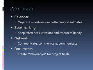 The document discusses using web 2.0 tools for collaboration in the cloud. It defines collaboration 2.0 as adding distributed computing and collaboration platforms that allow for distance and asynchronicity. Benefits include social networks functioning as professional networks and blending synchronous and asynchronous work. Various categories of tools are covered, including social calendars, networking sites, bookmarking, desktops, wikis and documents. Examples like Google Docs, Dropbox and PBWorks are provided. The document advocates using these tools for projects, communication, organizing information and backups.