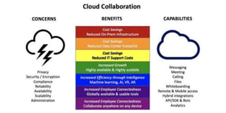 The document outlines the concept and advantages of cloud collaboration, emphasizing its role in enabling real-time document sharing and team collaboration regardless of location. Benefits include improved team efficiency, faster access to large files, and support for remote employees, while also highlighting the need for specific features in collaboration tools like version control and real-time communication. It discusses various cloud service types and tools available for effective collaboration, reaffirming the growing importance of cloud technology in modern workplace environments.