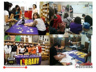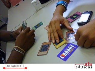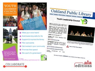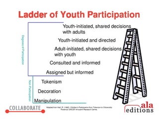 The document discusses teen participation and collaboration in libraries. It emphasizes moving from passive programming for teens initiated by libraries to active involvement of teens in planning, decision-making, and implementation of services. This includes establishing teen leadership councils and committees to give teens ownership over programming and activities. The benefits are outlined as helping libraries become more relevant while providing developmental opportunities for teens such as learning social and cultural competencies.