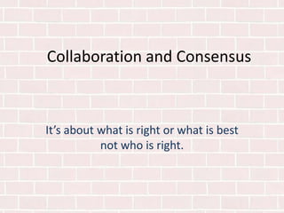Collaboration and consensus are about finding what is right or best for achieving an objective, not about who is right. Collaboration is the process of working together with others to achieve an objective, while consensus is broad agreement among a group. To reach consensus, one must bring ideas to the table but also step back from personal ideas to focus on the mission, determining which ideas best accomplish the mission and using those ideas.