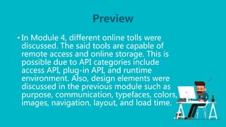 This module discusses collaboration and team content development. It introduces roles for collaborative web development teams, including project manager, web strategist, content specialist, web designer, developer, and inbound marketer. It also discusses platforms for collaboration like Google Apps, Google Docs, Google Sheets and Google Slides. Lastly, it lists additional applications that can be used for collaboration like Prezi, Slideshare, Mind Meister, Dropbox, Amaya, IM Creator, Wix, and Evernote.