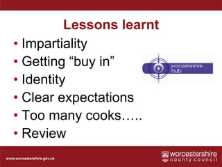 Worcestershire County Council aims to provide e-learning opportunities to allow for continued development and training with reduced budgets. The council plans to cut £45 million from its budget between 2011-2014 through initiatives like the Better Outcomes, Lean Delivery program and increased use of e-learning. The council has created resources like the Worcestershire E-Learning Zone and WHUB E-Learning Zone to deliver topics such as equality and diversity training and social care e-learning to employees in a cost-effective manner.