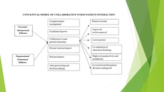 This document discusses various models and issues related to collaboration within and outside of nursing. It begins by defining collaboration and explaining its importance for addressing complex health issues. Several models of collaboration are described, including the clinical school of nursing model from 1995, the dedicated education unit clinical teaching model from 1999, and the research joint appointment model from 2000. The document also covers collaborative issues that can arise within nursing between different roles, and outside nursing with other healthcare professionals. Overall, the document provides an overview of the meaning, need for, and approaches to collaboration in nursing.