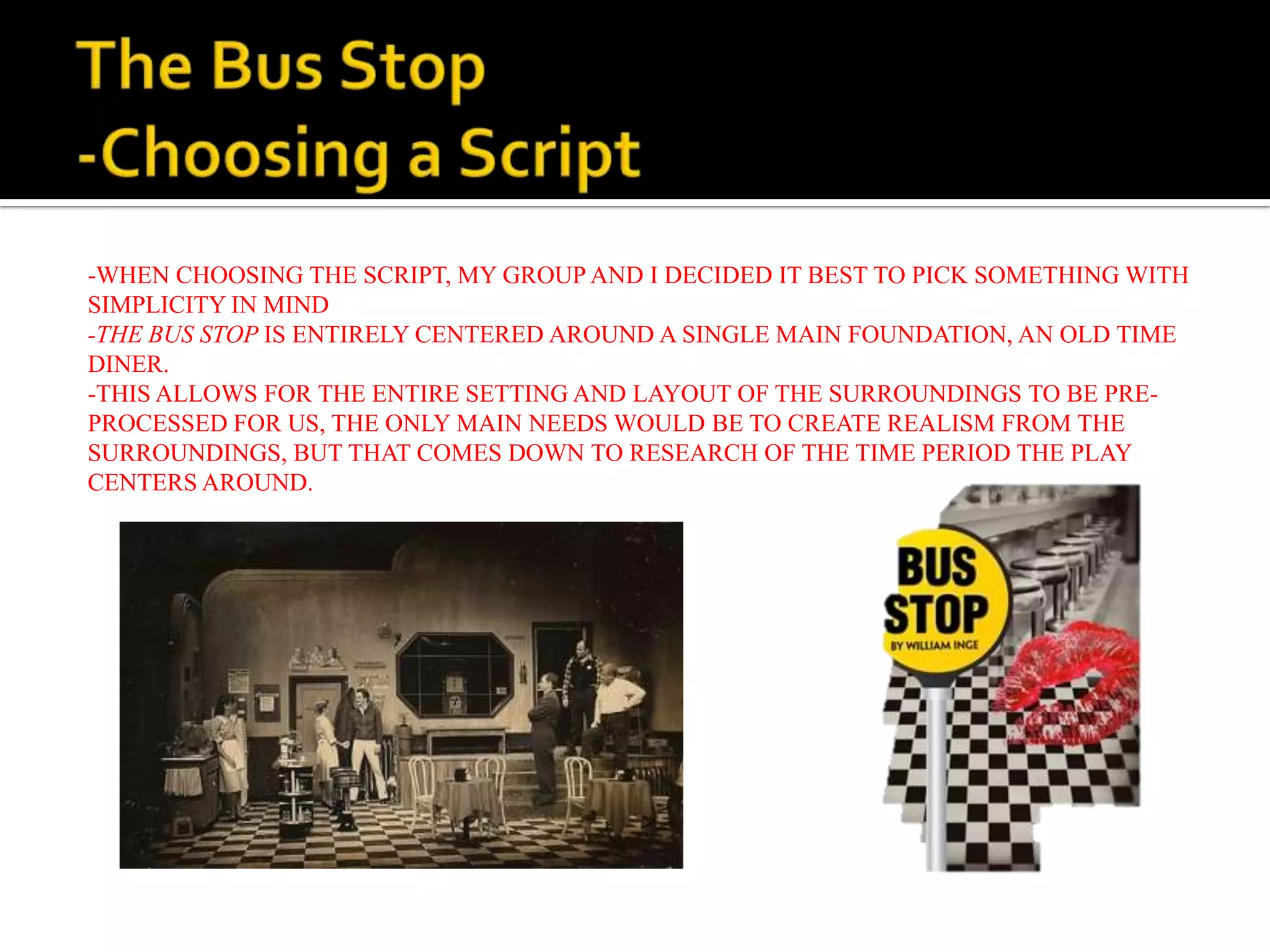 This document summarizes the key details of a play called "The Bus Stop". It discusses that the play is centered around a diner setting and revolves around the themes of love and relationships. It introduces the main characters and their actors. The main conflict involves the poor relationship between characters Cherie and Bo. It notes that the play examines what true love should look like and that people are always searching for love. The overall theme is that love can be found anywhere at any time.