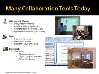 The document discusses how technology has enabled communication and collaboration anywhere, anytime, and on any device. It lists various technologies such as video conferencing, mobile phones, messaging, and collaboration tools that allow people to communicate and work together regardless of location. It also discusses how these technologies can be used for education by extending the classroom and disseminating content digitally. Finally, it profiles the characteristics of different generations in the workplace from Traditionalists to Generation Y.