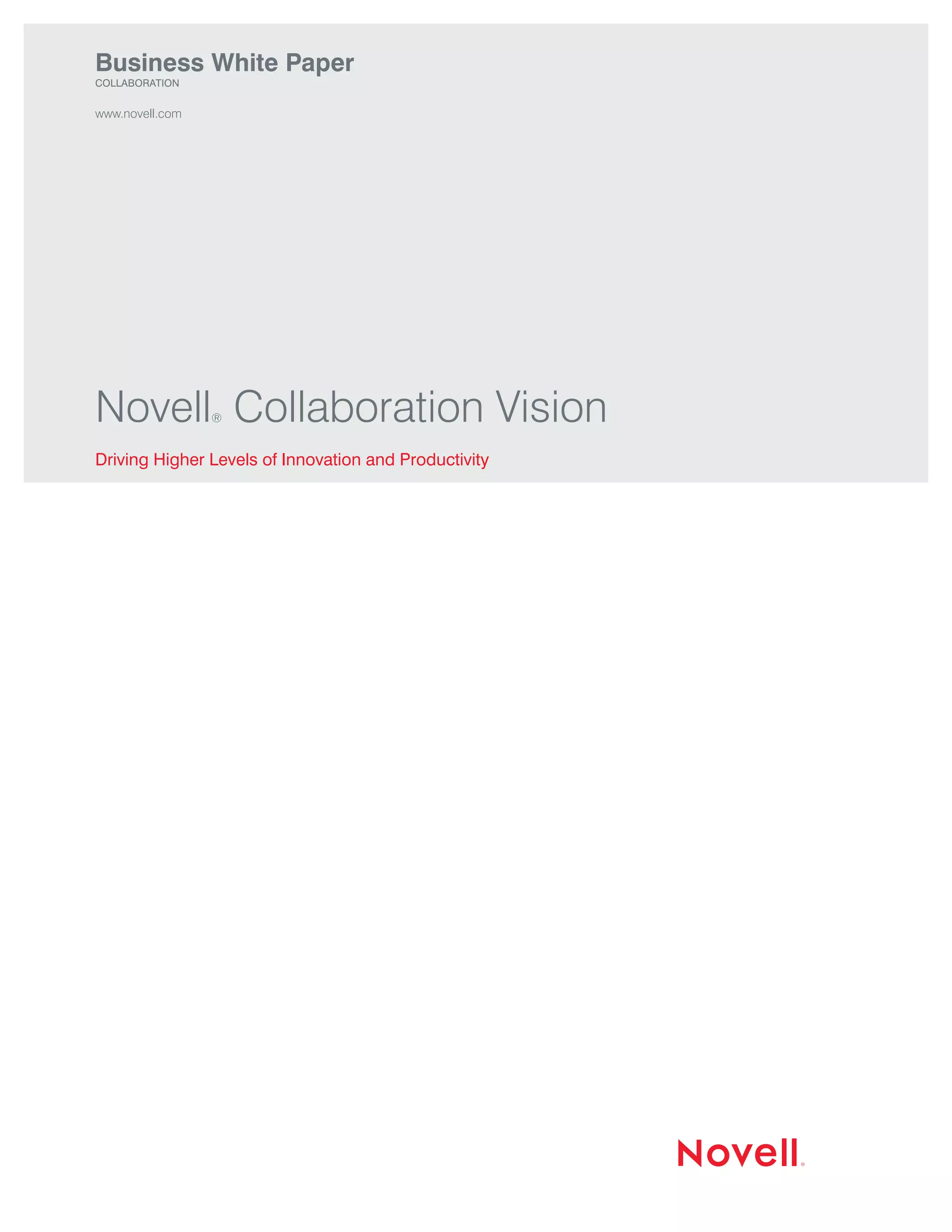 Novell's collaboration vision enables organizations to leverage existing IT investments to securely converge traditional and new collaboration tools. The open architecture brings together disparate systems using enterprise security. Novell DataSync synchronizes data across applications and devices in real-time. The vision provides a long-term strategy to integrate preferred tools like email, social media, and mobile in a secure manner that drives innovation.