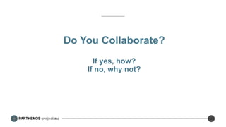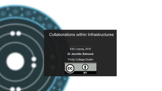 This document discusses collaboration in digital humanities projects and infrastructure. It addresses whether humanists typically collaborate and how, examining modes like teaching, conferences, and online communities. True collaboration is defined as multi-disciplinary, co-authored work or lab-style projects with a common goal. Digital humanities requires collaboration between different domains like library science, computer science, and the humanities. Successful digital humanities infrastructure projects also require collaboration between researchers, users, institutions, and other stakeholders. The document outlines some challenges to collaboration, like different vocabularies between specialists, and the importance of trust, shared values and expectations, knowledge sharing, and intermediaries to bridge gaps.