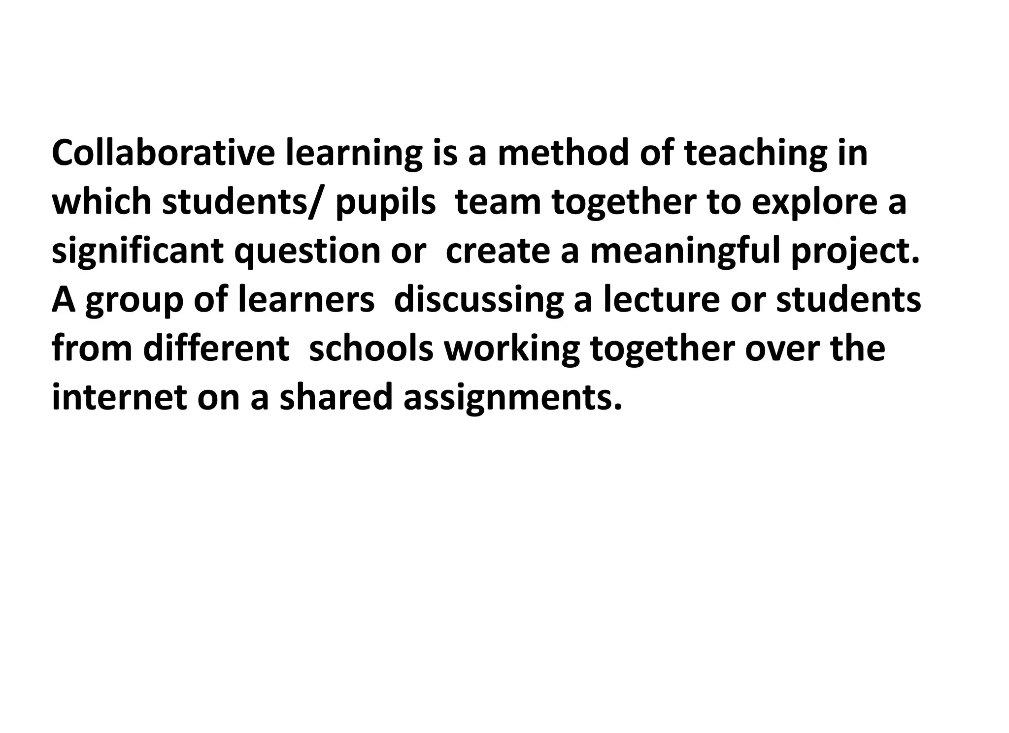 Collaborative learning involves students working together in small groups to solve problems or complete tasks. It emphasizes social interaction and discussion as part of the learning process. The key principles of collaborative learning are positive interdependence among group members, individual accountability, interpersonal skills like communication, and group processing. Benefits include developing higher-order thinking, improved communication skills, increased student engagement and satisfaction, and better retention of information.