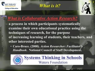 Collaborative action research is a process where educators systematically examine their own practices using research techniques to improve student learning. It involves teams of practitioners working together to investigate issues relevant to them. There are typically five phases: (1) identifying problems, (2) planning actions, (3) collecting data, (4) analyzing data, and (5) planning for future actions based on results. Collaborative action research is advocated for because it allows educators without research expertise to improve, and collaboration facilitates discussion of issues and perspectives.