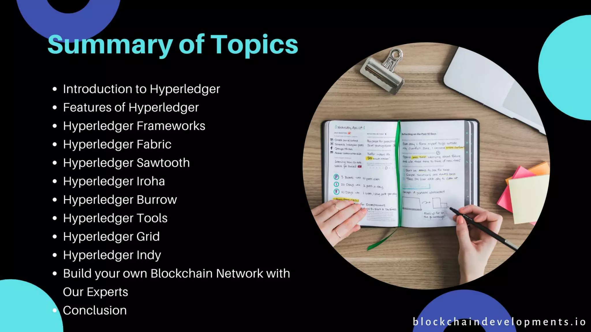 The document provides an overview of Hyperledger, an open-source collaborative blockchain project started by the Linux Foundation aimed at creating secure and transparent transactional applications across various industries. It describes key Hyperledger frameworks including Fabric, Sawtooth, and Iroha, as well as tools like Caliper, Composer, and Explorer, highlighting their features and use cases. The document also emphasizes the opportunity for developers to contribute to Hyperledger projects and offers services for building custom blockchain networks.