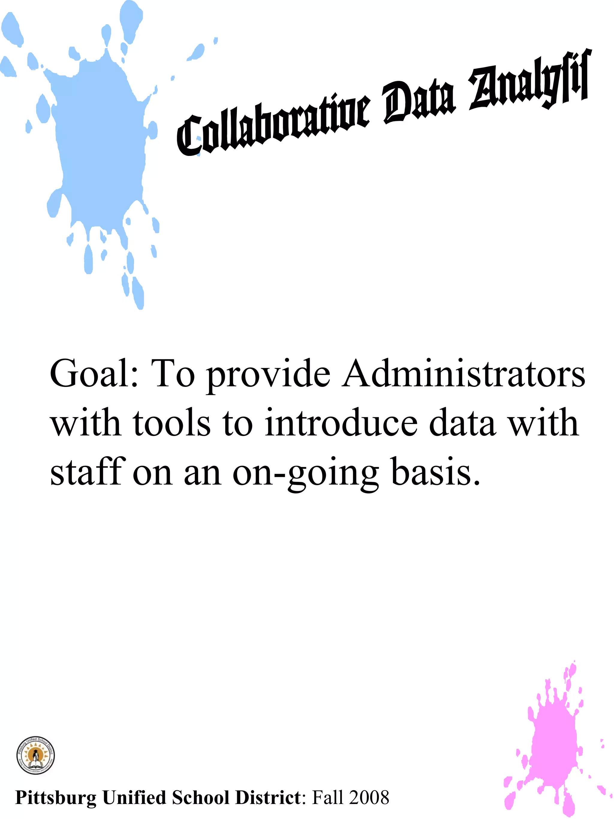 The document outlines an agenda and materials for a school district workshop on collaborative data analysis. The workshop introduces tools and reports in their online data system to help administrators and teachers analyze student performance data at the district, school, and classroom levels. Participants will work in groups to examine sample reports, discuss findings, and identify next steps for instructional improvement.