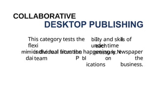 The document outlines the framework for a collaborative desktop publishing project in which a team of seven members must create a four-page newspaper, including specific sections such as news, editorial, features, and sports. It details the resources allowed for the project, various newspaper layout elements, and principles of design necessary for effective communication and organization. Additionally, it provides guidelines on production, writing standards, and source acknowledgment for the newsletter, emphasizing the importance of clarity, simplicity, and visual appeal.