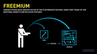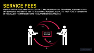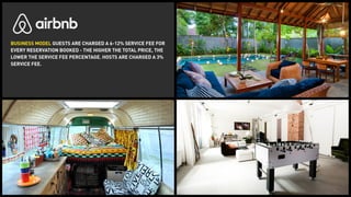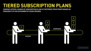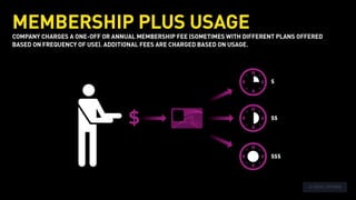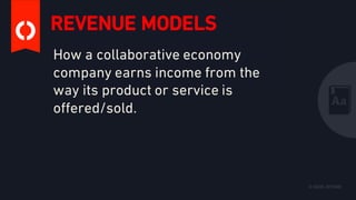 The document outlines various revenue models used by companies in the collaborative economy, such as service/commission fees, flat subscriptions, and tiered memberships. It provides specific examples, like TaskRabbit's 20% service fee and Borrow My Doggy's tiered subscription plans, illustrating how different platforms generate income. Additionally, it mentions pricing structures tied to user numbers and membership tiers for services like Love Home Swap.