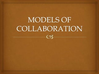 This document defines collaboration and discusses its importance in nursing. It provides definitions of collaboration from nursing theorists Virginia Henderson and Baggs and Schmitt. The document outlines the need for collaboration between nursing education and hospital nursing due to gaps in practical skills among new graduates. It discusses objectives, principles, characteristics, phases and types of collaboration, as well as issues that can impact collaboration within and outside of nursing. The document also summarizes several models of clinical education that aim to strengthen collaboration between academia and clinical practice settings.