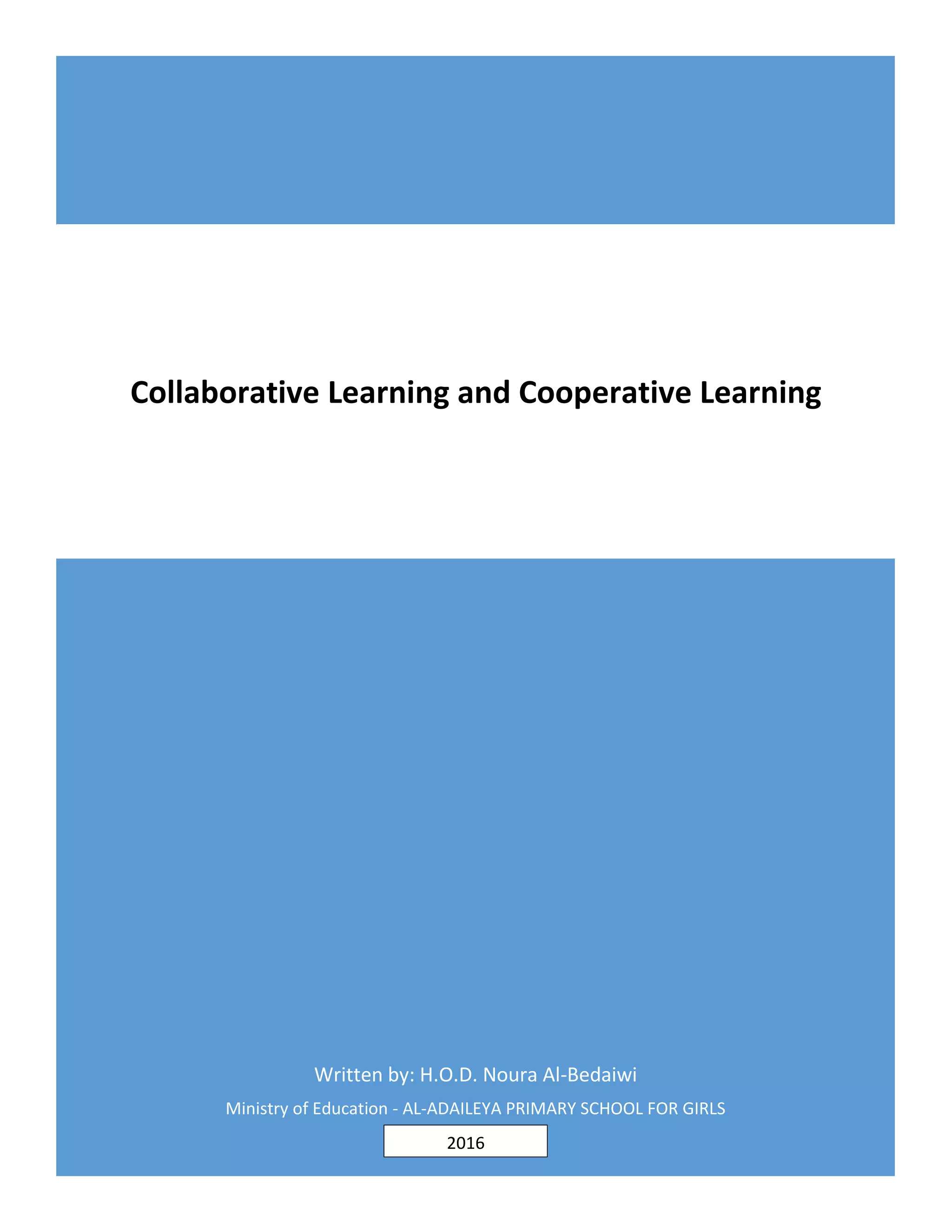 The document discusses the new Kuwaiti National Curriculum, highlighting the integration of cognitive and social skills with language proficiency for fostering independent learners. It distinguishes between cooperative and collaborative learning approaches, emphasizing their roles in enhancing students' confidence, social skills, and various cognitive abilities. The text also outlines the importance of teacher facilitation, motivation strategies for young learners, and the appropriateness of each learning approach based on students' competencies and needs.