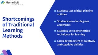 The document discusses the shortcomings of traditional learning methods and promotes collaborative learning as a solution, emphasizing group work to improve critical thinking, creativity, and understanding of concepts. It outlines strategies for effective collaboration, the teacher's role, and various types of collaborative learning, including problem-based and formal groups. Additionally, it highlights how Mastersoft can facilitate collaborative learning through software that supports group formation, assessment, and resource sharing.