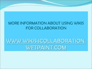 A wiki is a website where users can collaboratively add, edit, and modify content using only a web browser. Wikis allow for easy communication and sharing of knowledge within groups. Some key advantages of wikis for collaboration include visibility of everyone's work, the ability to learn from others, and the potential for prompt teacher feedback. Factors that enhance wiki collaboration include user-friendly interfaces, clear organization of content, and making contributions visible and accessible.