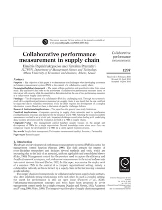 This article discusses the challenges of developing a common performance measurement system for a collaborative supply chain. Through a case study of a supply chain in the fast moving consumer goods industry, the authors examine two potential collaborative performance measures - inventory levels and product availability. They find that inventory levels cannot reliably be measured collaboratively due to data limitations. Measuring product availability would require a complex information sharing system across the supply chain. The key challenges revealed include underlying data inconsistencies, the need to synchronize business processes, and determining an appropriate collaborative evaluation method.