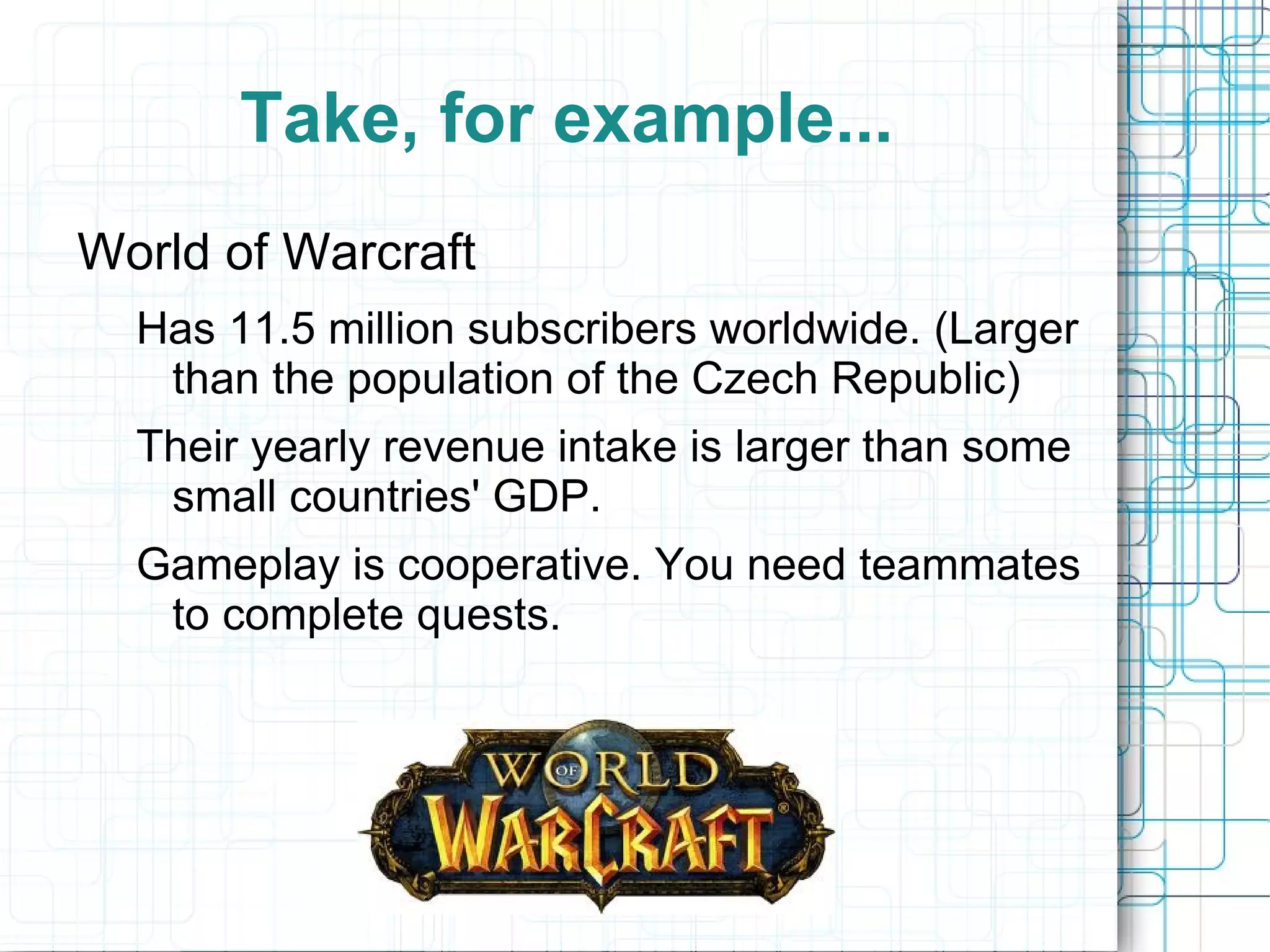 Web 2.0 refers to interactive websites and services. The massively multiplayer online role-playing game World of Warcraft has over 11.5 million subscribers, generating more revenue than some countries' GDPs. Blogging allows people to share thoughts, information, and debate views while documenting life experiences. Gamification takes non-fun activities and adds interactive or competitive elements. Internet memes involve adding funny captions to pictures, while trolling refers to pranking or posting inflammatory comments online.