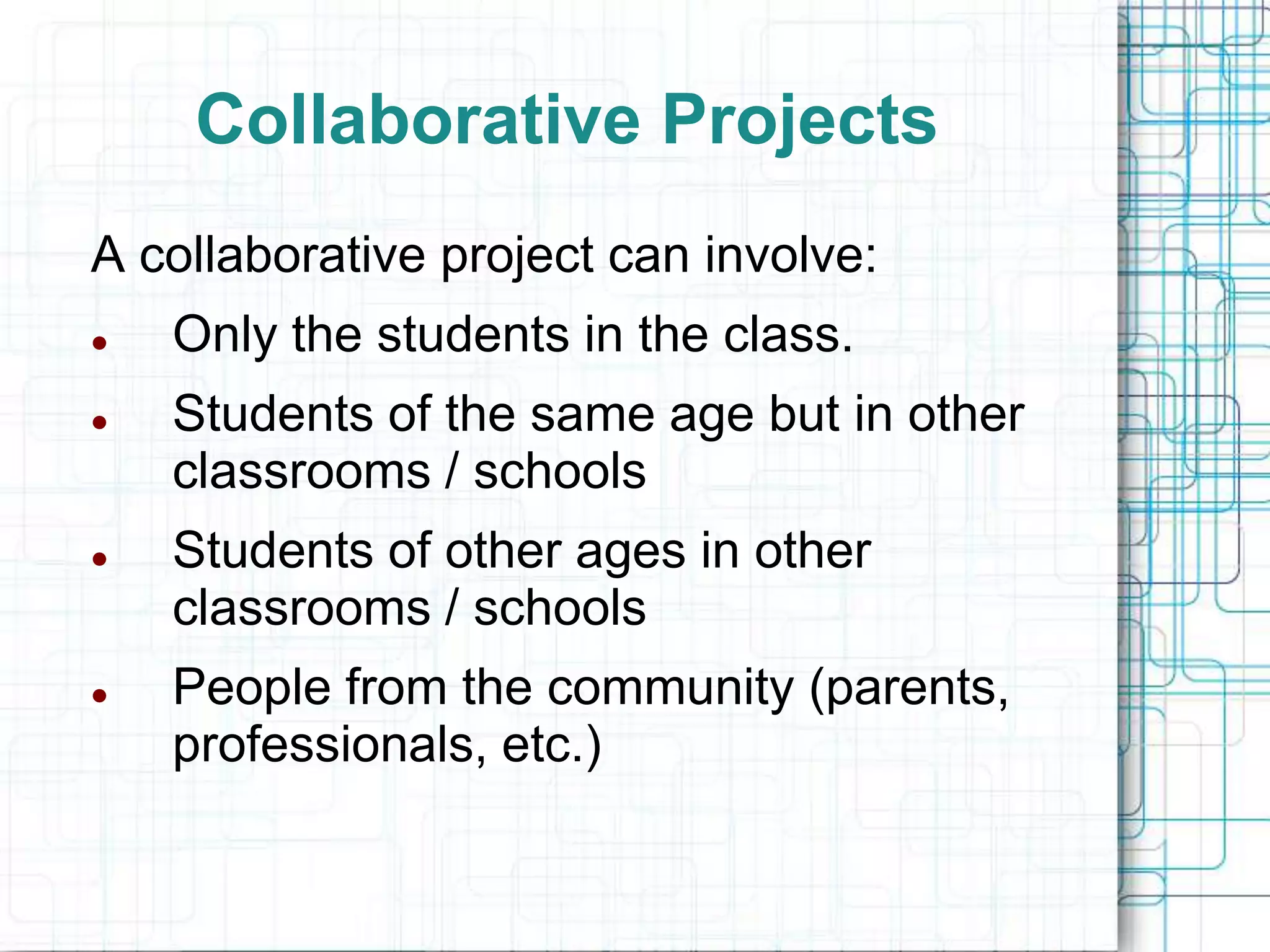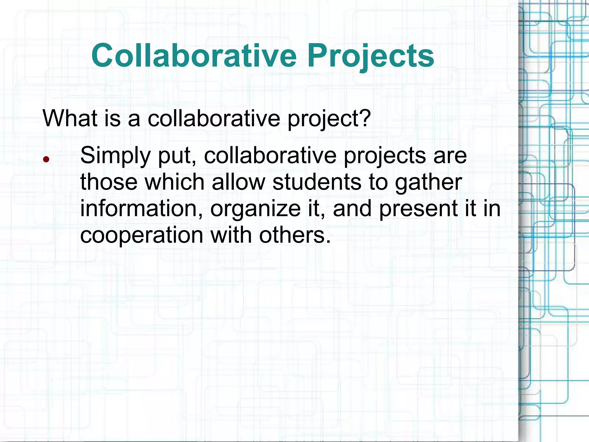 A collaborative project involves students gathering information, organizing it, and presenting it together. It can involve students within a class, across classes/schools, of different ages, or include community members. The key is that students are responsible for the results and must work as a group. When implementing collaborative projects, teachers should consider group dynamics, challenging but not overwhelming students, and assigning roles to distribute work evenly. Examples include having student groups create an educational video about a chemistry element by assigning researcher, writer, and videographer roles.