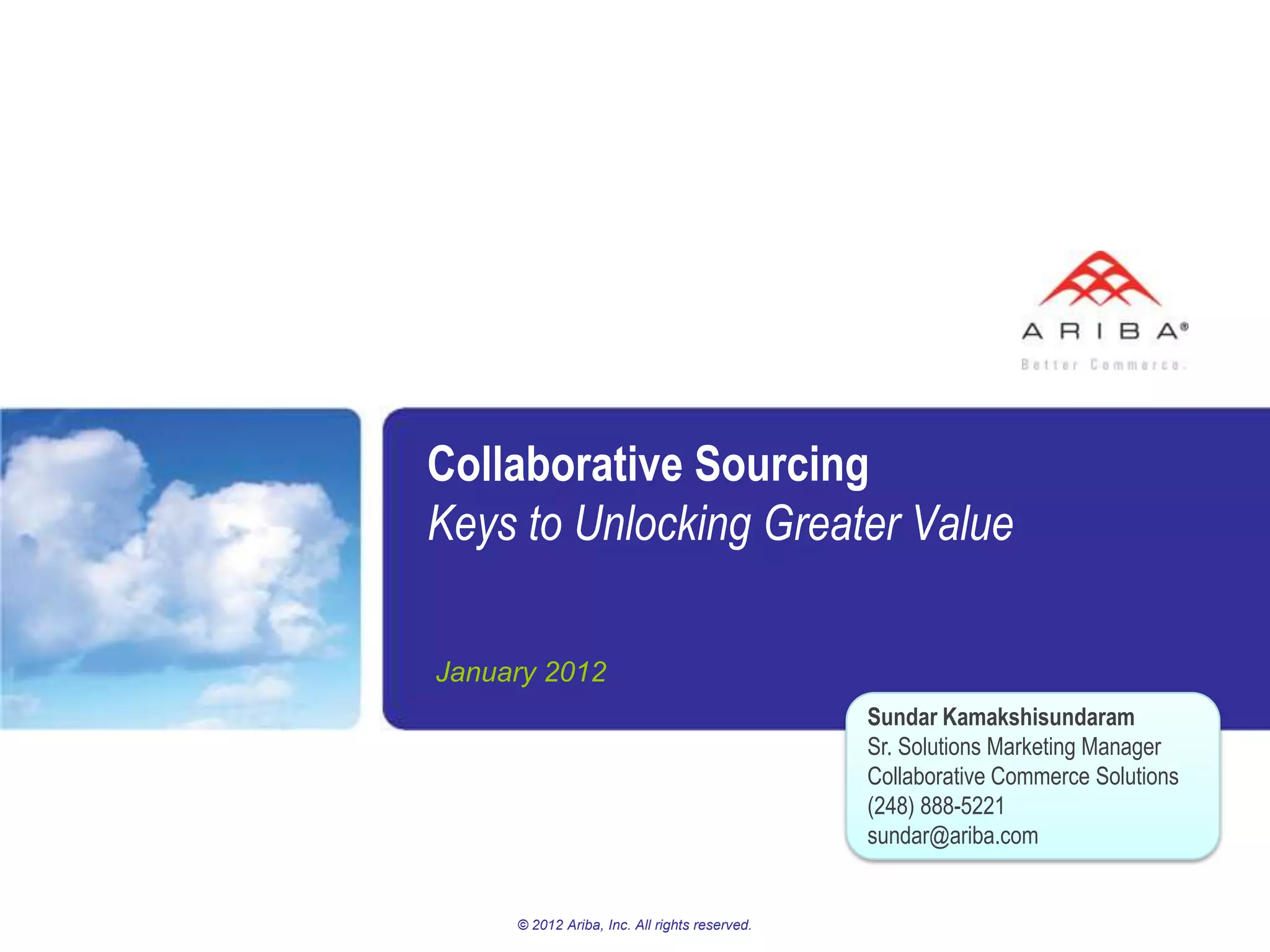The document discusses collaborative sourcing as a way for companies to unlock greater value. It notes that CEOs are focusing more on sourcing to reduce costs and drive profits. While cost savings is a top priority for procurement executives, collaboration is also key. The document outlines Ariba's collaborative sourcing framework and capabilities, including spend analysis, sourcing, contract management, and supplier management. It positions Ariba's technology and network as enabling improved collaboration between buyers and suppliers.
