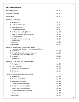 This document provides a toolkit for new leaders in developing collaborative healthcare teams. It contains 5 modules that address key topics for building effective interprofessional teams. The first module discusses leadership concepts and styles that are important for leading teams, such as transformational leadership that focuses on relationships and empowering individuals. It also identifies qualities of effective leaders, including being able to learn and adapt to different situations. The module provides guidance for new healthcare leaders on developing strong leadership to establish collaborative teams.