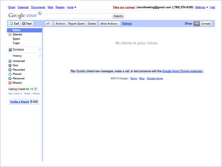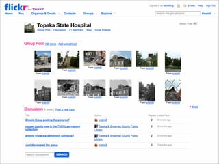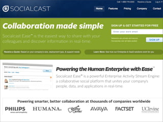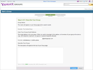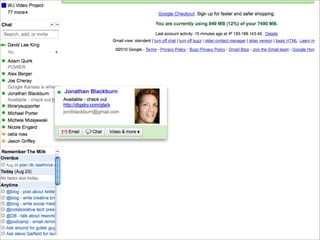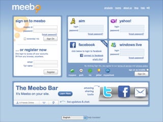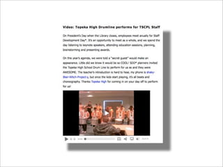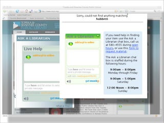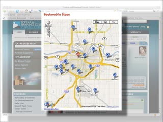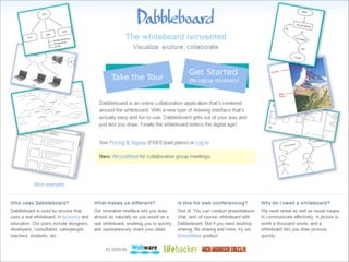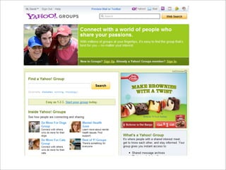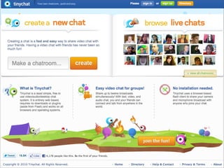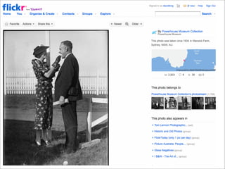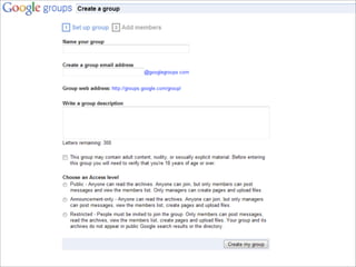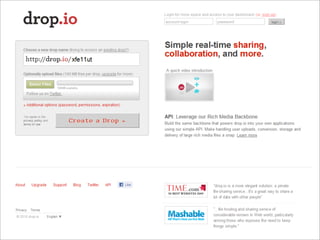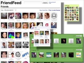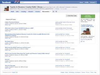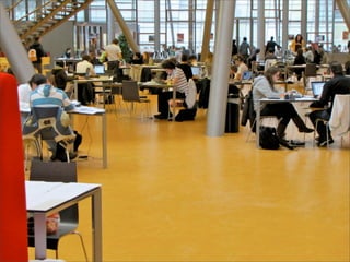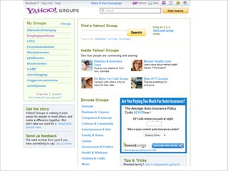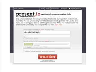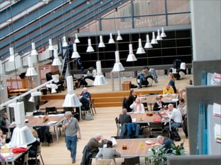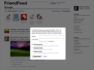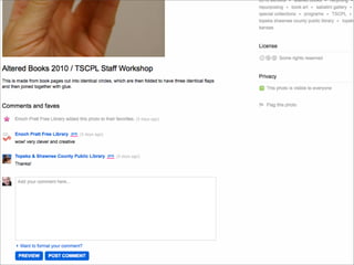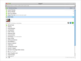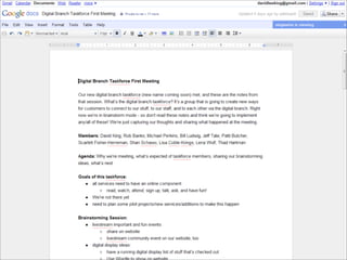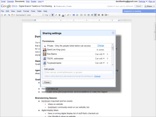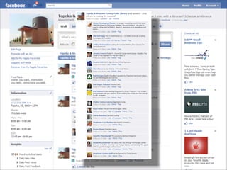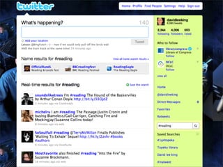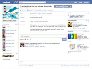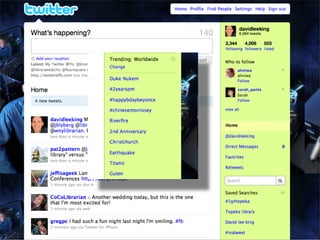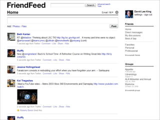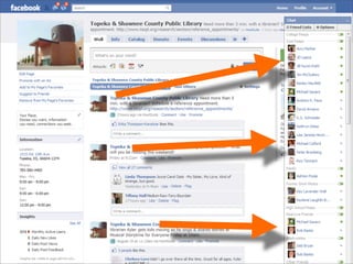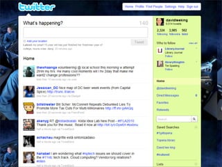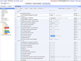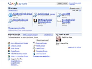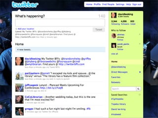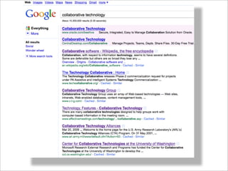 Collaborative technology in libraries allows people to work together on projects and documents over local and remote networks. The document discusses how social networks, private social networks, conversation tools, multimedia, meetings, sharing files, and collaborative workspaces can utilize collaborative technologies. It provides examples of using tools like social networks, wikis, comments, and mashups to engage users and bring people together to work on common tasks.