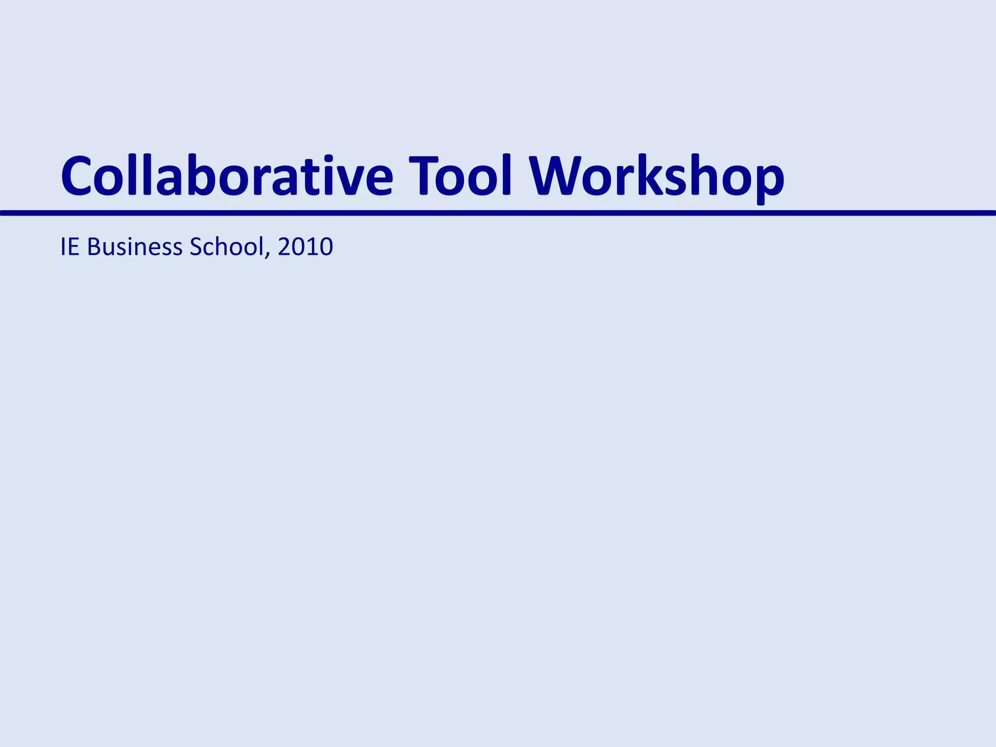 The document summarizes a workshop on collaborative tools that was held at IE Business School in 2010. It provides an overview of sessions on online surveys, video/audio conferencing, collaborative project management, document sharing, wikis, discussion forums, slide sharing and screen casting. Each session describes the basic and advanced functionalities of collaborative tools like SurveyMonkey, Skype, Basecamp, Google Apps, Wikispaces, Vyew and SlideShare.