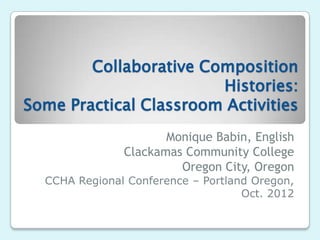 This document outlines some practical classroom activities for collaborative composition. It begins by defining collaboration and exploring the historical basis in theorists like Bakhtin, Barthes, and Foucault. Benefits of collaboration are discussed, including generating complex thought and mirroring real-world practices. The document provides a scaffolding model called IMSCI and describes establishing inquiry, modeling, shared writing, and independent writing. Additional collaborative activities are presented, such as using wikis and think-pair-share techniques.
