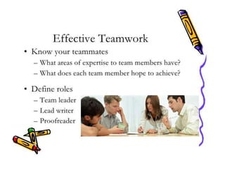 The document provides tips for effective group work, including understanding the benefits of collaboration, showing respect for others, checking egos at the door, establishing a timeline, not discouraging members, giving all a chance to contribute, and avoiding negative comments that could hurt feelings.