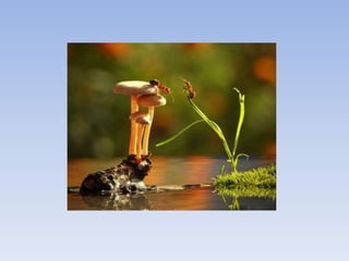 This document discusses three photographs that the author likes: a close-up photo of a cat's eye showing reflections and detailed fur; a macro photo of an American quarter showing contrast between the black surface and silver coin with engraved details; and a photo of ants coordinating over mushrooms and grass blades highlighted by light reflections. The author appreciates the fine details, dynamic contrasts, and coordinated macro subjects captured in each photo.