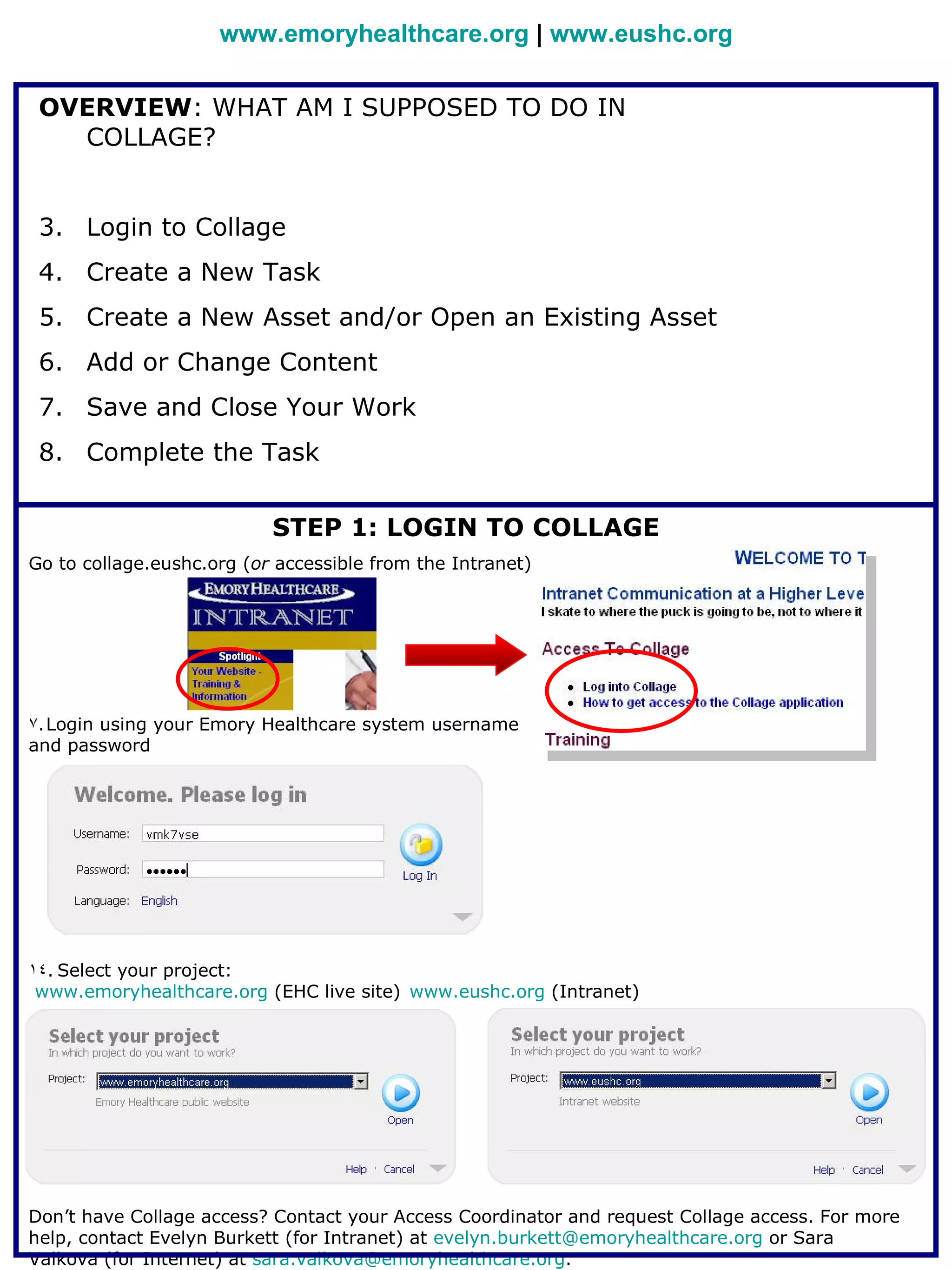 The document provides instructions for using Collage, Emory Healthcare's content management system. It outlines 8 steps: 1) Login to Collage, 2) Create a New Task, 3) Create a New Asset or Open an Existing Asset, 4) Add or Change Content, 5) Save and Close Your Work, 6) Complete the Task, 7) Contact support staff if you need help accessing Collage, and 8) Provides additional details on specific features like creating tables and adding links.