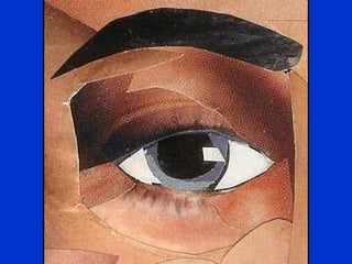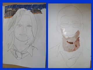 This document discusses an art project where students created self-portrait collages. It provides instructions for students to first make an outline drawing of themselves focusing on proportions. They then broke up the facial forms into shapes of tone and used collage materials like colored papers and textures to represent these tones. The document includes examples of student work at various stages and questions for students to reflect on techniques and how they approached the project. It emphasizes observing proportions and using collage to represent the tonal qualities of the face.