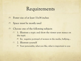 This document provides requirements and guidance for a collage project. Students must create a poster-sized collage of at least 11x14 inches that takes up most of the space and illustrates either a stance on a topic or themselves. They should consider the composition, how materials like newspaper or photos will be cut, and whether other media will be included. Examples of collage artists Hannah Hoch and Romare Bearden are provided for inspiration.