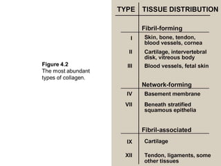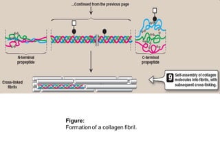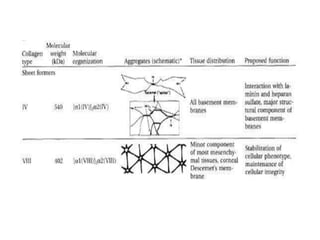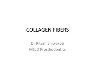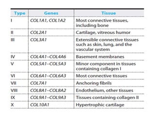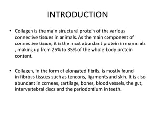 This document discusses collagen fibers. It begins by introducing collagen as the main structural protein in connective tissues, making up 25-35% of body protein. Collagen forms elongated fibrils found in tissues like skin, tendons, and bones. It then describes the triple helix structure of collagen and types I-III that form fibrils and networks. Type I collagen comprises many supporting tissues, while type II is found in cartilage. The document also notes medical uses of collagen in skin grafts and cosmetics, as well as genetic diseases associated with collagen deficiencies.