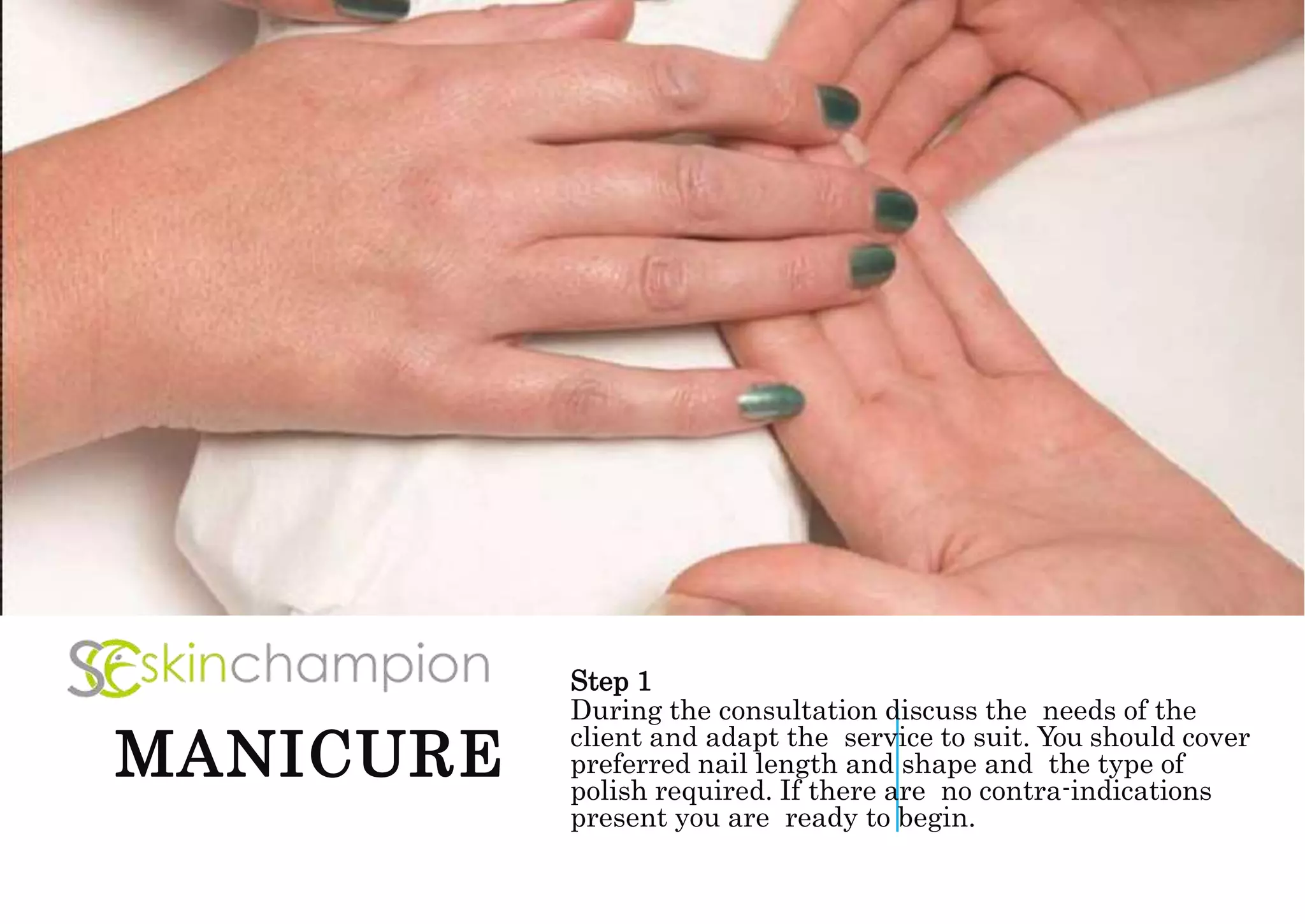 The document outlines a detailed step-by-step process for performing a manicure, which includes client consultation, nail preparation, cuticle care, and massage techniques. It emphasizes proper sanitation and the use of appropriate tools while addressing client preferences for nail colors and finishes. The procedure concludes with the application of a base coat, varnish, and topcoat for a professional result.