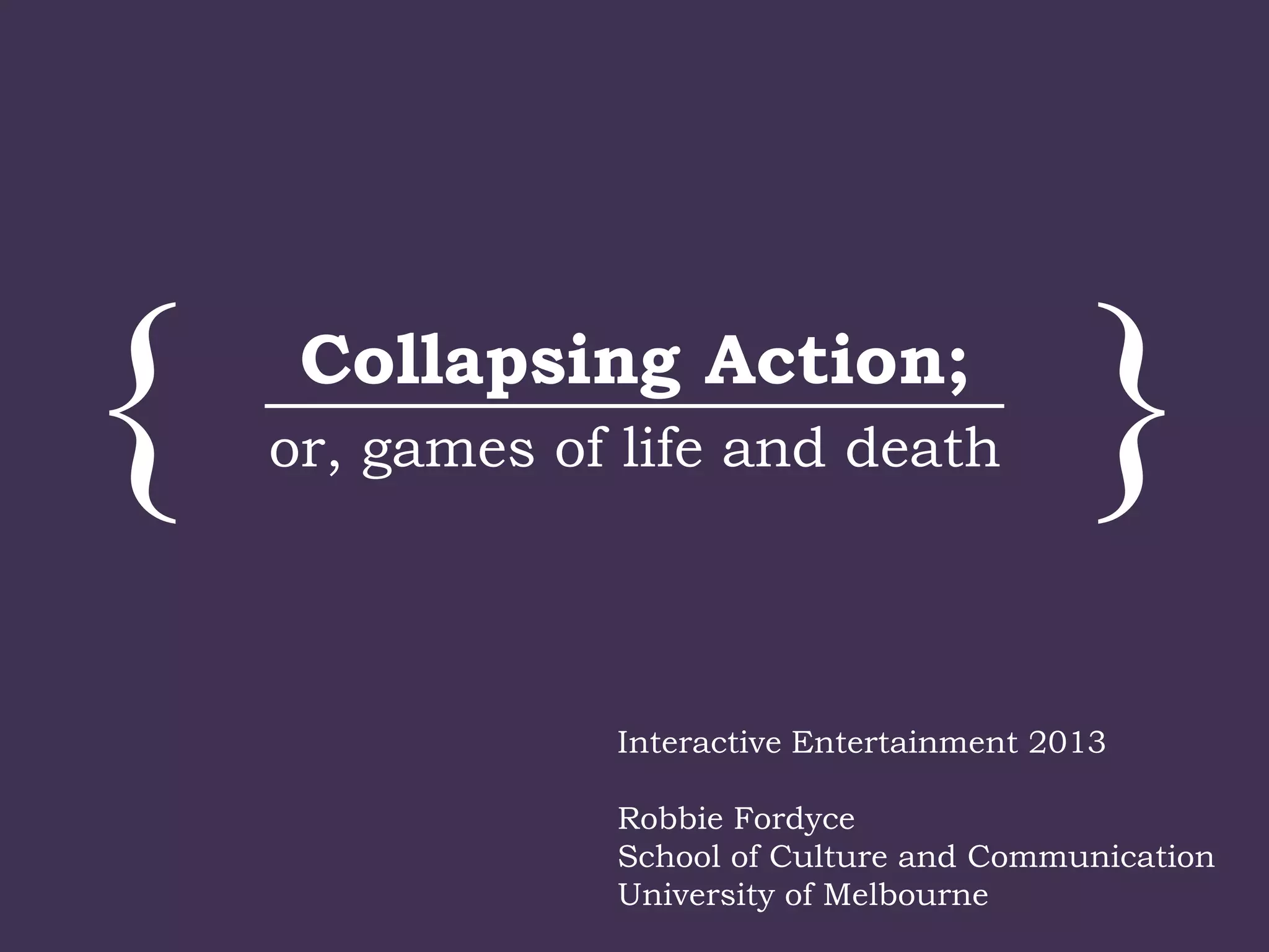This document discusses several examples of collapsed or inert virtual worlds from video games where interactive elements have been removed, including a Fallout 3 game world with no interactable objects, a Minecraft world with all landscape features removed, the city of Magnasanti from Sim City 3000 with no inhabitants or activity, and a Dwarf Fortress where the fortress and inhabitants have been destroyed, leaving an empty virtual space. These examples demonstrate two types of collapse or inertness in virtual worlds through attrition of interactable elements or through bringing order to chaos by removing or organizing all features.