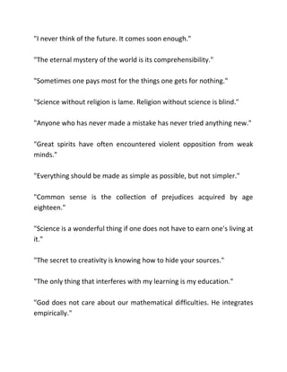 This document contains over 30 quotes from Albert Einstein on a wide range of topics from science and mathematics to philosophy, politics, and religion. Some of the key themes expressed in the quotes include Einstein's curiosity about the mysteries of the universe, his belief that imagination and intuition are more important than knowledge, and his views that humanity must pursue rational knowledge and understanding rather than fear or blind faith.
