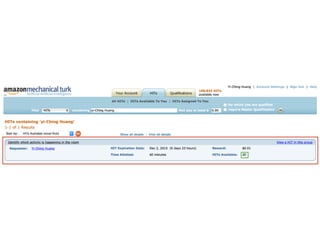 1) Amazon Mechanical Turk is a crowdsourcing marketplace where requesters can create Human Intelligence Tasks (HITs) for workers to complete for a reward.