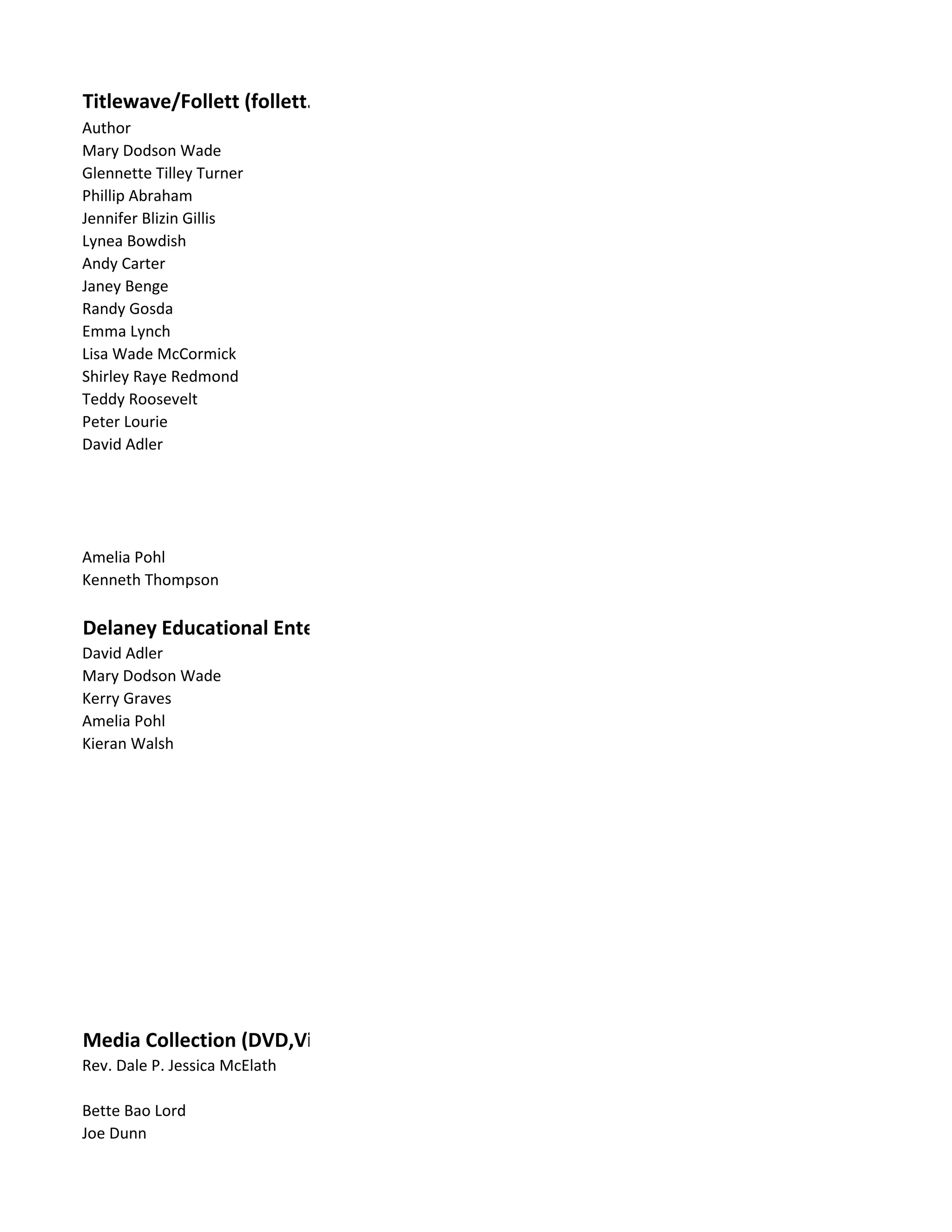 This document lists authors and titles of books, ebooks, media, and publishers. It includes over 100 book titles focused on topics like presidents, history, and folktales. The books are published by various educational publishers and available through different distributors including Follett, Barnes & Noble, and Amazon. Publication years range from the 1990s to recent years and books cover a wide range of grade levels from K-3 to middle school.