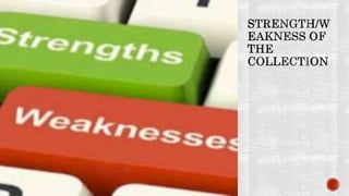 The document outlines a study conducted by the DLSU libraries focused on assessing the current collection levels of printed books across various subject areas. It highlights the need for objective metrics to evaluate collection quality and delineate appropriate acquisition activities in relation to university programs. Recommendations include a concrete three-year acquisition plan to improve areas with inadequate collections, guided by a proposed formula based on existing collection levels and publishing outputs.