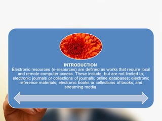 The document discusses guidelines for developing an electronic resources collection policy. It addresses challenges in acquiring electronic resources, such as access, interfaces, technical support and licensing. The purpose of the policy is to provide guidelines for selecting appropriate electronic resources and establish consistency in managing this part of the library's collection. Selection criteria address formats, access, user-friendliness, costs, vendors, technical considerations, licensing agreements and pricing. Resources may be cancelled based on low usage, duplication of content, or failure to meet user needs or budget constraints. The role of libraries is to provide access to electronic information through digital networks and adopt multimedia technologies.