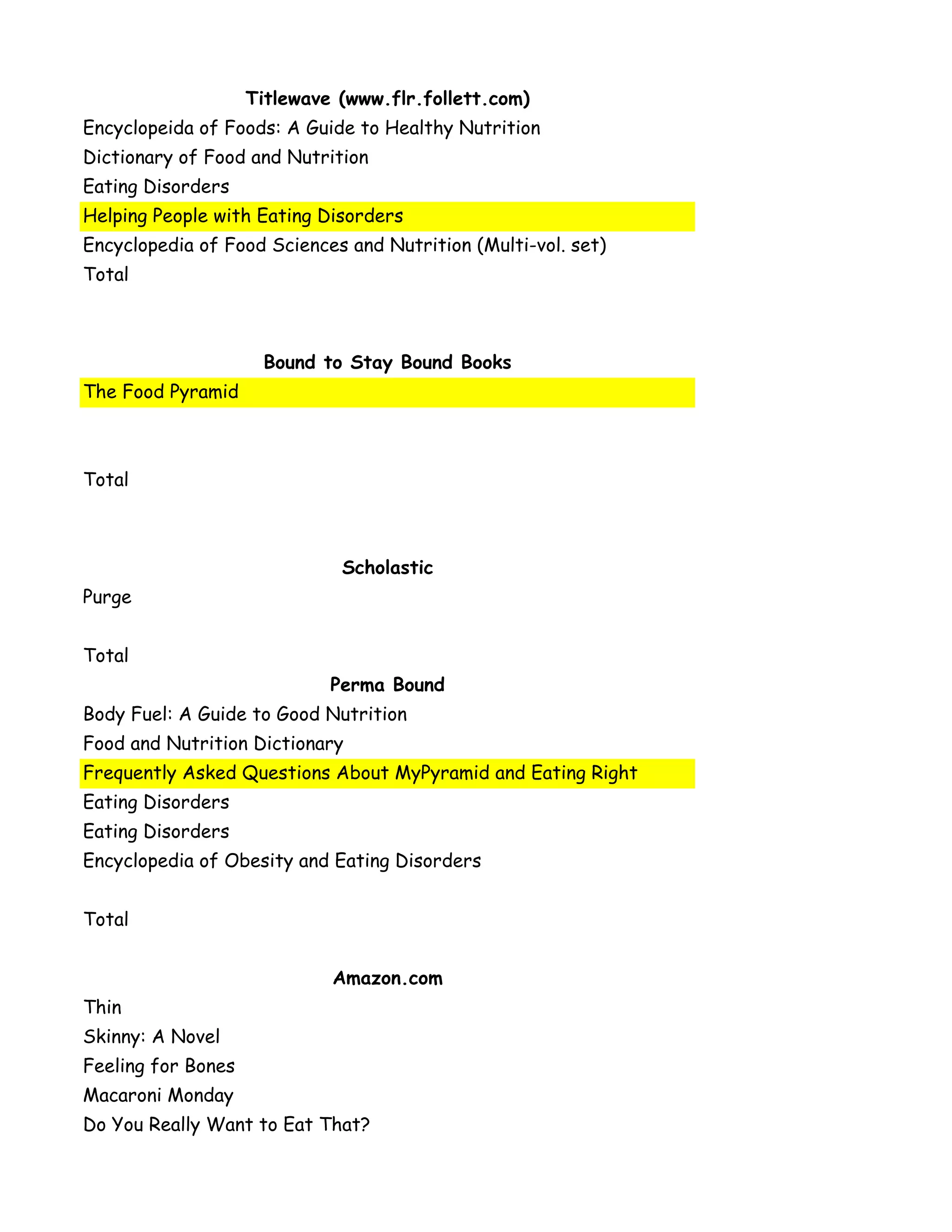 This document provides a summary of materials available from various publishers on topics related to food and nutrition. It includes titles of books and videos, their authors and publishers, prices, ISBN numbers, dates, target grades, and reviews when available. The total value of materials from all sources is $3,785.33. Materials cover a range of topics from general nutrition, food science and the food pyramid to specific issues like eating disorders. Publishers represented include Titlewave, Bound to Stay Bound Books, Scholastic, Perma Bound, Amazon and Learning ZoneXpress.